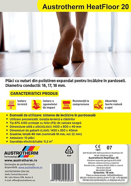 Caracteristici tehnice placa cu nuturi pentru incalzire in pardoseala, Austrotherm Thermofloor 20 – EPS 150